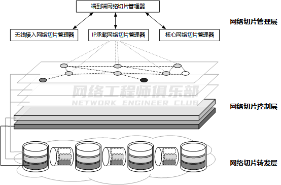 网络切片控制层用来在物理网络中生成不同的逻辑网络切片实例,提供按需定制的逻辑拓扑连接,并将切片的逻辑拓扑与为切片分配的网络资源整合在一起,构成满足特定业务需求的网络切片。