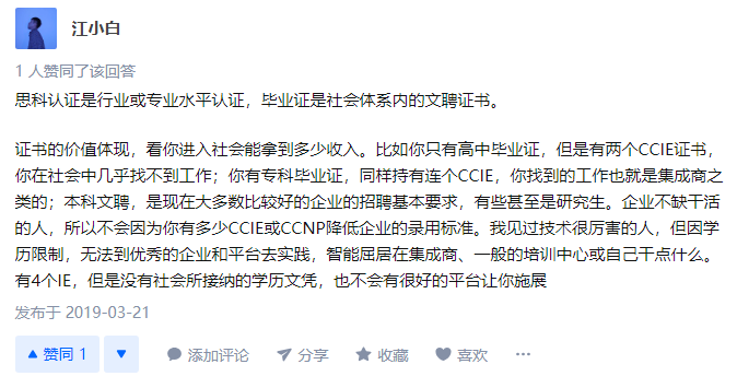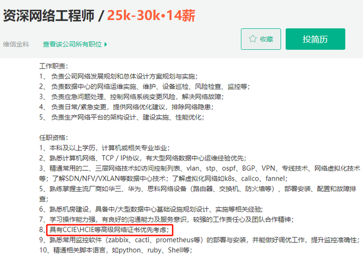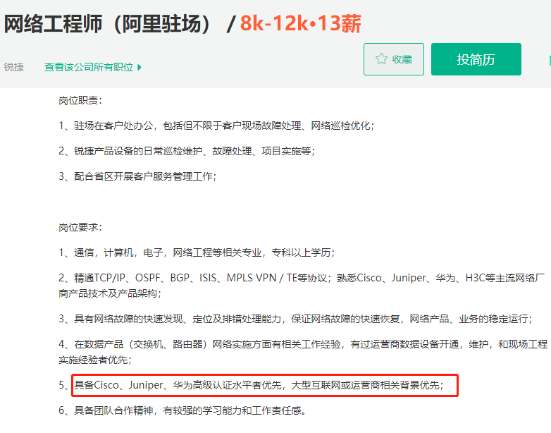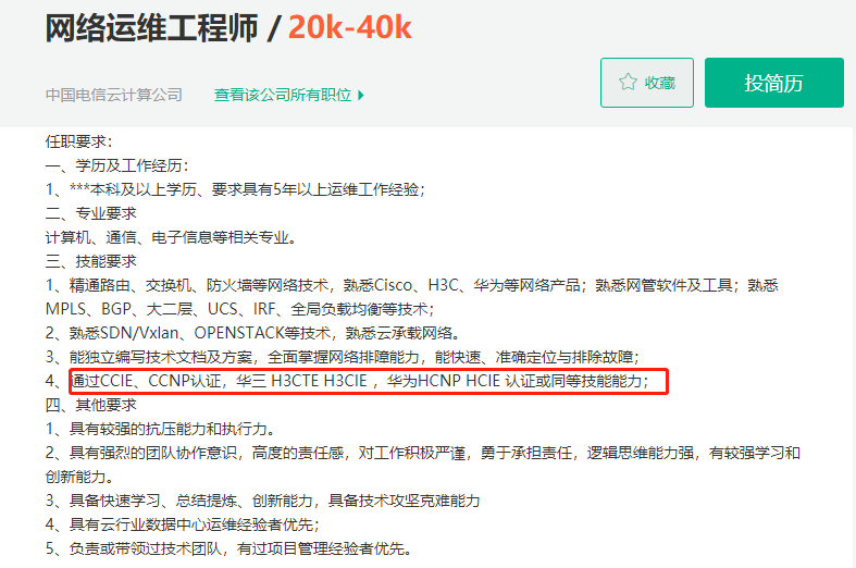 因为人才市场里的IE人才变多了,企业随之对于招聘网工的标准也抬高了,慢慢发展成“必须有证”的情况。