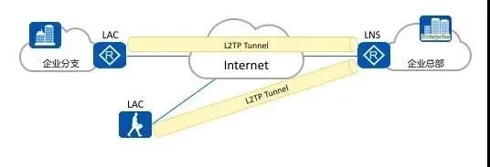 一般是由分支路由器充当LAC与LNS建立L2TP隧道,这样就可实现分支与总部网络之间的数据通过L2TP隧道互通。