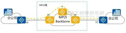 MPLS VPN网络一般由运营商搭建,VPN用户购买VPN服务来实现用户网络之间(图中的分公司和总公司)的路由传递、数据互通等。