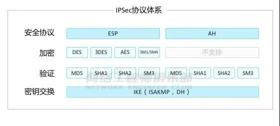 IPSec不是一个单独的协议,它给出了IP网络上数据安全的一整套体系结构,包括AH(Authentication Header)、ESP(Encapsulating Security Payload)、IKE(Internet Key Exchange)等协议。