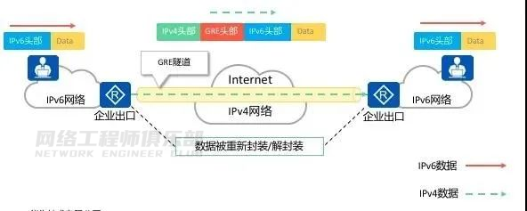 如图所示,通过在IPv4网络上建立GRE隧道,解决了两个IPv6网络的通信问题。