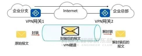 位于隧道两端的VPN网关,通过对原始报文的“封装”和“解封装”,建立一个点到点的虚拟通信隧道。