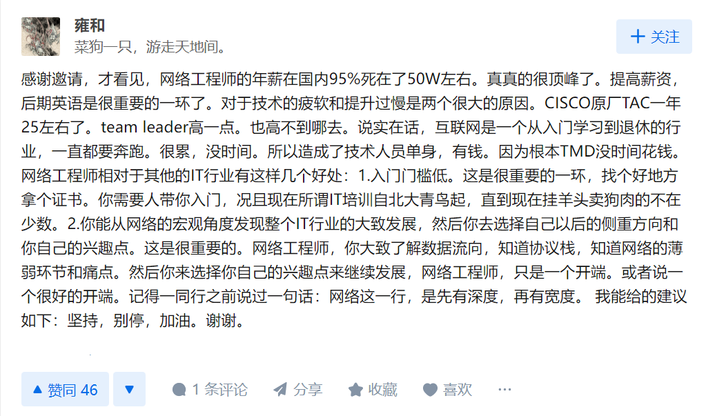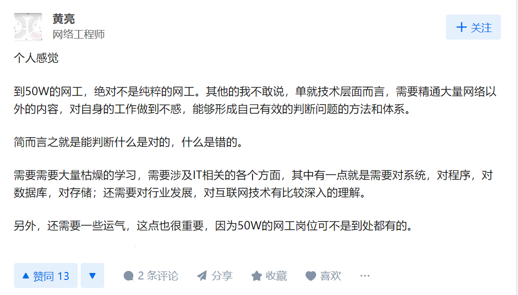 但在网工这行不同,50w的年薪,的确对很多普通人来说,足够吹上一辈子了。