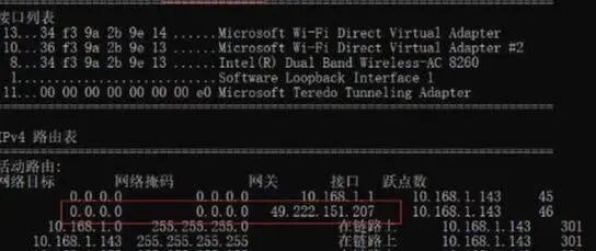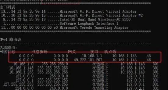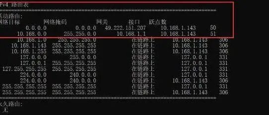 使用route print命令看一个0.0.0.0的网络目标分别映射你的外内网的网关。