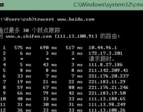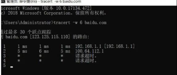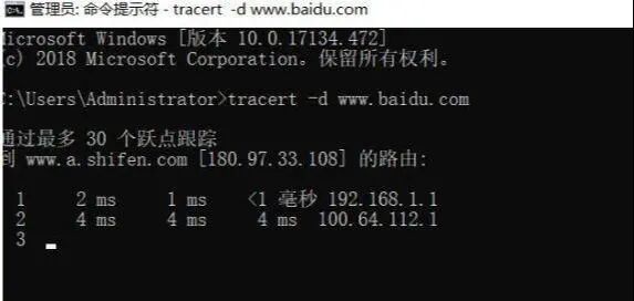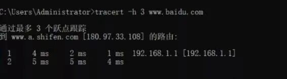 “tracert -h 3 baidu.com”代表本次tracert搜索的最大跳数,输入3表示搜索在路由器跳转3次,如下图所示:
