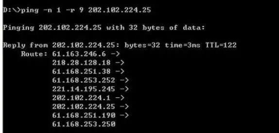 ping -n 1 -r 9 202.102.224.25 (发送一个数据包,最多记录9个路由)