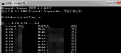 在命令提示符中输入“arp -a”并回车;自动在缓存中,读取IP地址和mac地址的对应关系表;