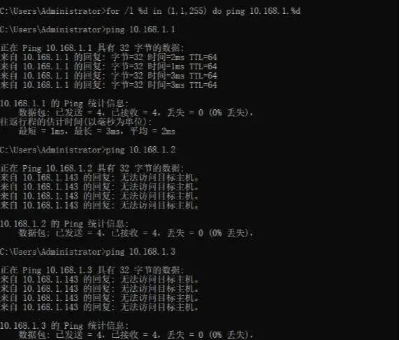 那么这段“for /L %D in(1,1,255) do ping 10.168.1.%D” 代码是什么意思呢?