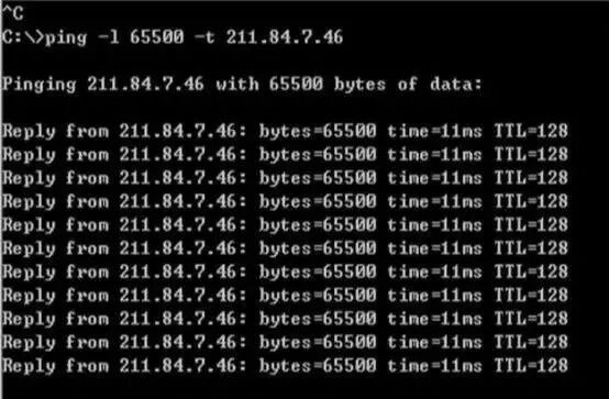 在默认的情况下Windows的ping发送的数据包大小为32byt,最大能发送65500byt。当一次发送的数据包大于或等于65500byt时,将可能导致接收方计算机宕机。