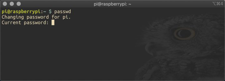 系统提示输入当前密码,(默认为‘raspberry’) 然后重复输入新密码,即可。