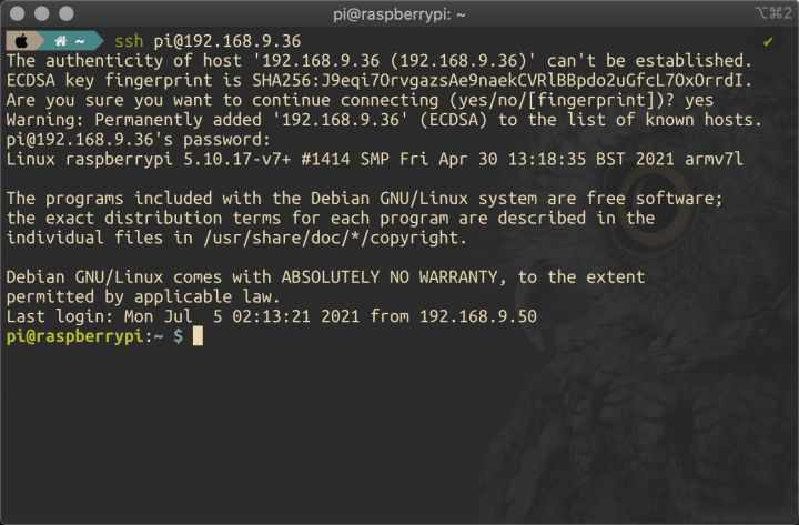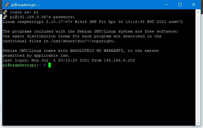成功登录后,你将看到 Raspberry Pi 的终端。现在,你可以通过此终端远程(在当前网络内)在你的 Raspberry Pi 上执行任何命令,而无需物理访问你的 Raspberry Pi。