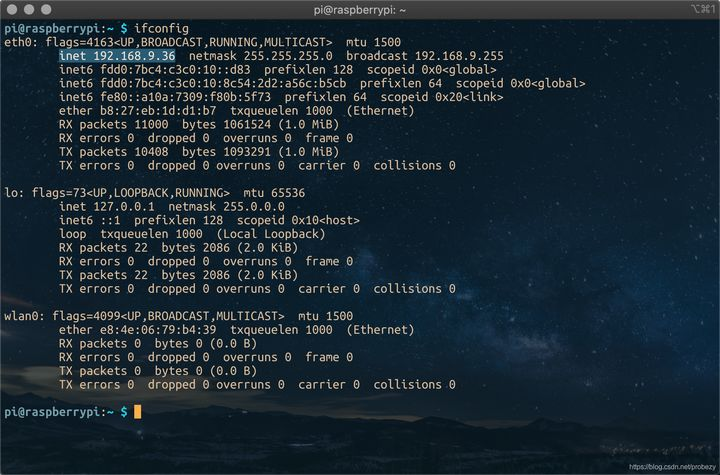 我使用以太网将我的 Raspberry Pi 连接到网络,因此它在 eth0 下。如果你在名为“wlan0”的条目下使用 WiFi 检查。