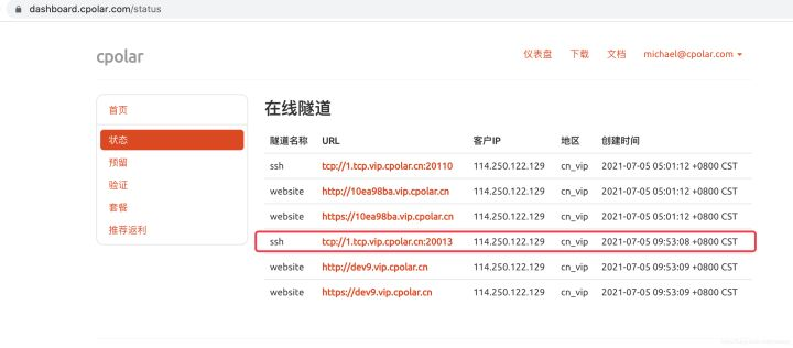 我们登录cpolar后台–>状态,查看一下ssh隧道映射的公网地址: