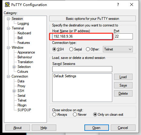下载完成之后,打开PuTTY,然后在session中的“Host Name”中输入树莓派的IP地址,然后点击”open”,即可连接树莓派了。