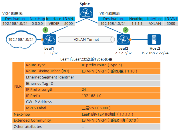图中Leaf1和Leaf2作为VTEP,同时作为三层网关,分别连接不同网段的主机Host1和Host2,以Leaf1向Leaf2发送路由为例。