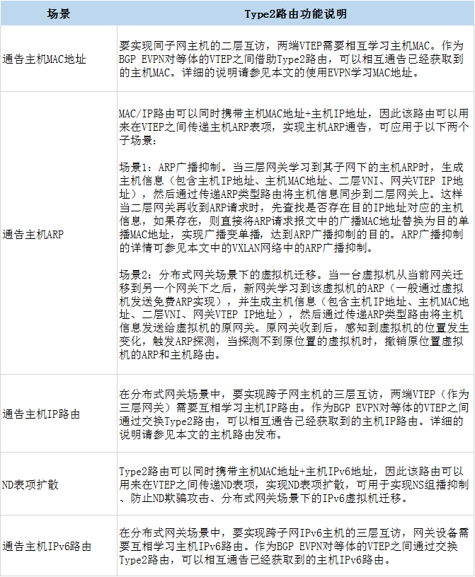 Type2路由在VXLAN网络中的使用场景和作用参见下表。