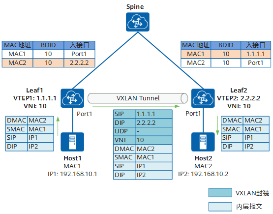 Leaf1收到Host1的报文后,根据报文入端口或VLAN信息判断其所属的BD,并在该BD内查找出接口(通过上一节使用EVPN学习MAC地址可以知道,Leaf1上会学习到Host2的MAC地址,出接口为VTEP 2.2.2.2)。