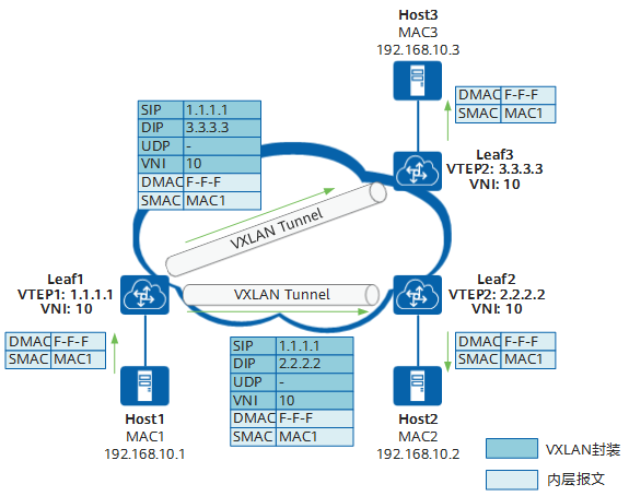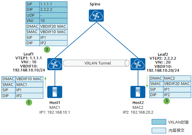 以Host1向Host2发送报文为例介绍报文在VXLAN网络中的转发流程: