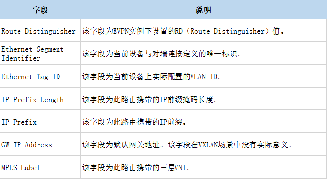 当携带主机IP地址时,主要用于分布式网关场景中的主机/网段路由通告,请参见本文的网段路由发布。