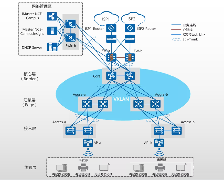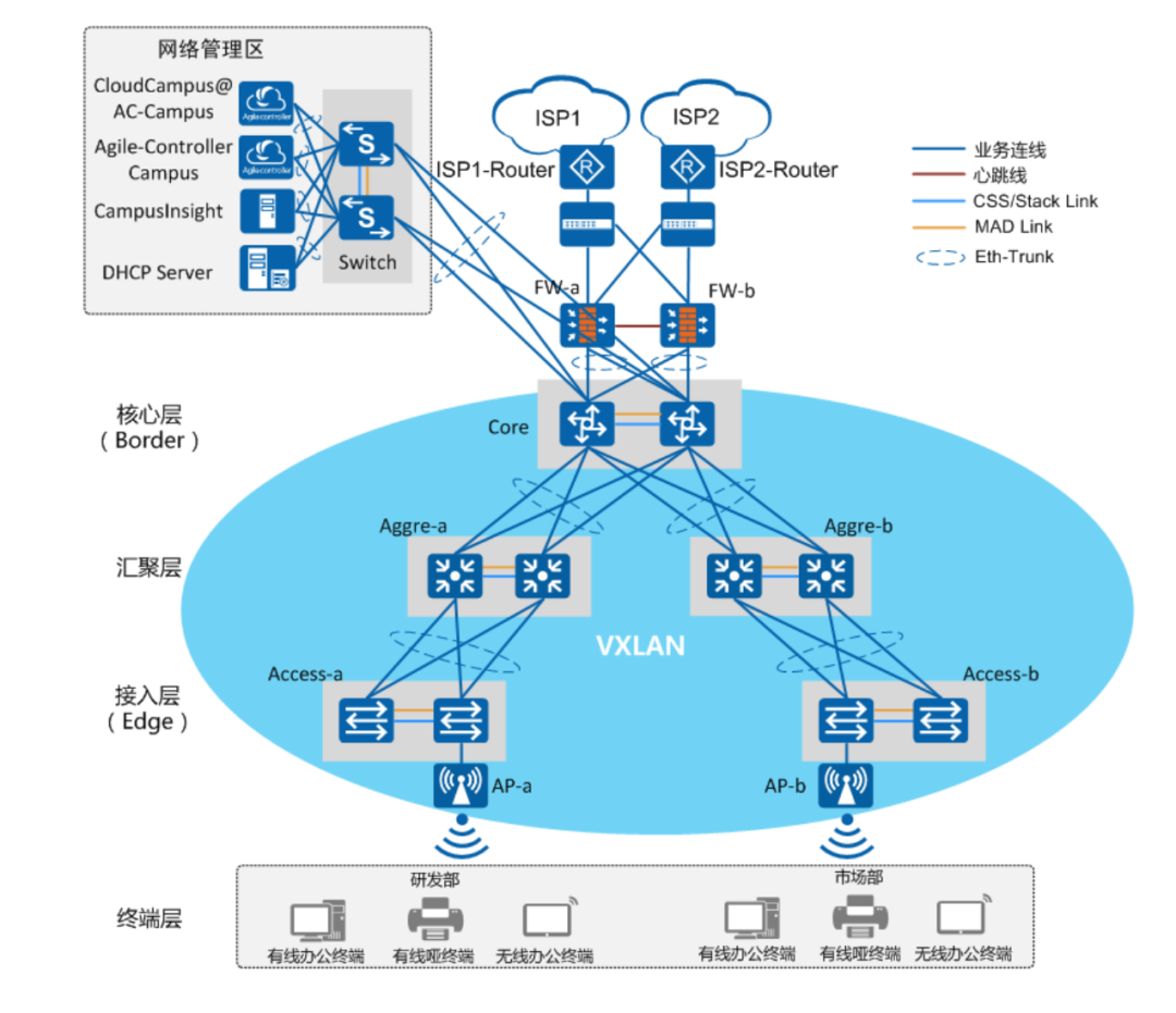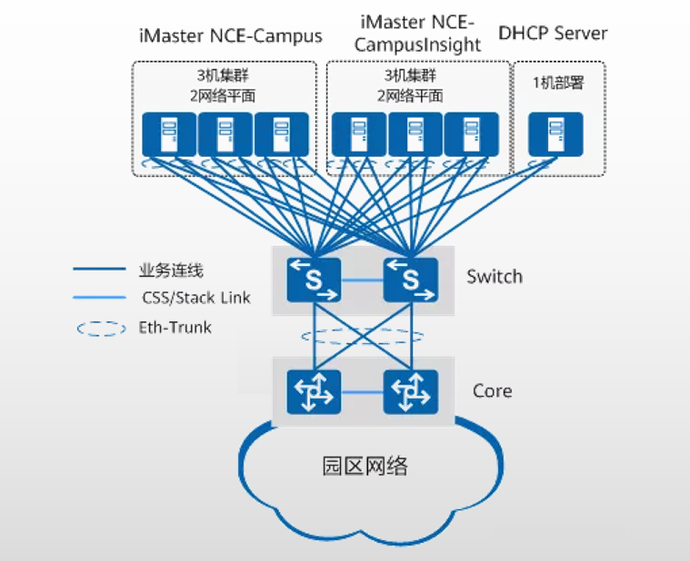 管理层部件主要涉及iMaster NCE-Campus、iMaster NCE-CampusInsight、DHCP服务器。