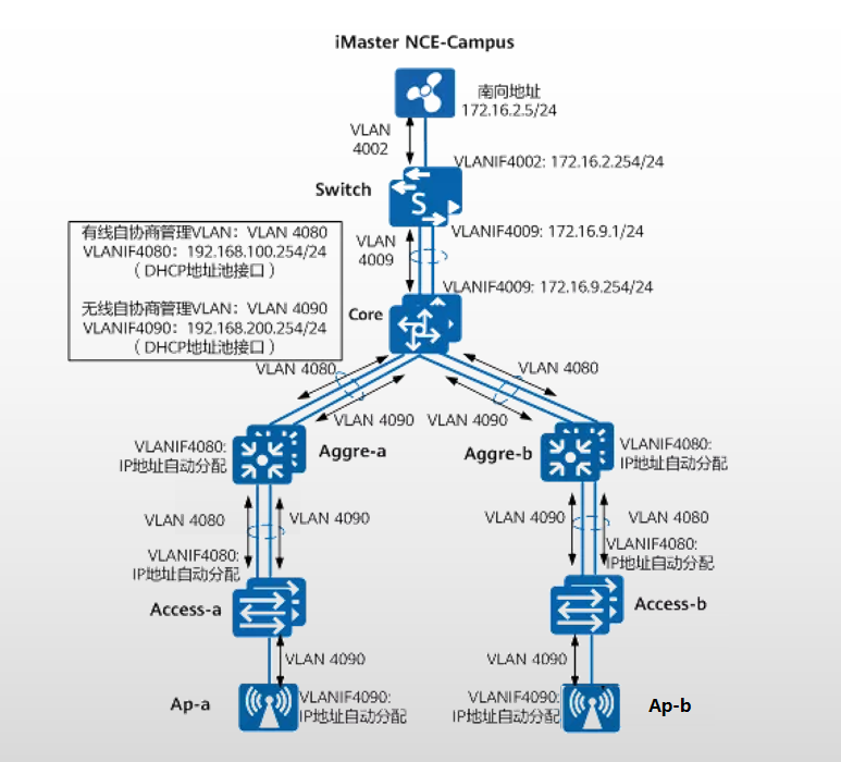 如图 6 所示,本案例中,核心交换机通过命令行使能NETCONF功能,配置iMaster NCE-Campus的南向地址和端口号为172.16.2.5:10020,与其南向对接的接口为VLANIF4009,IP地址为172.16.9.254/24。
