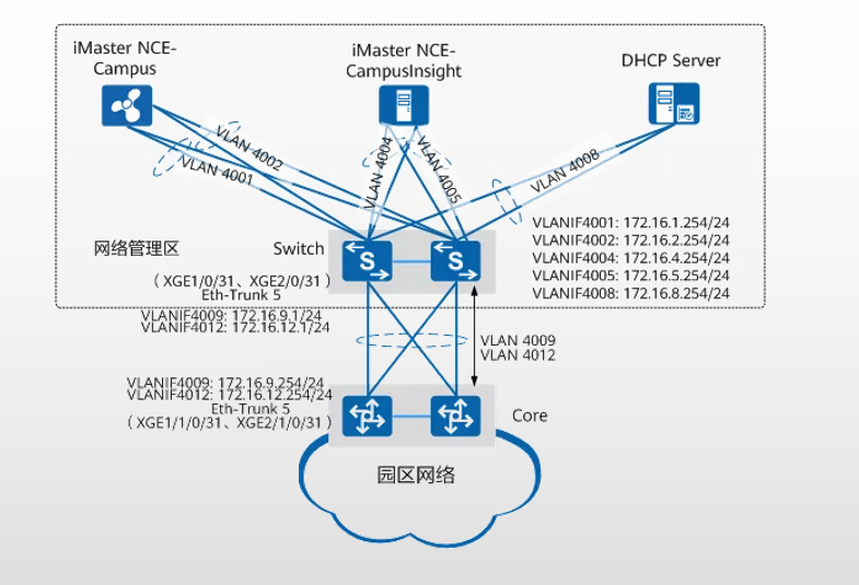 VLAN 4009用于iMaster NCE-Campus南向、iMaster NCE-CampusInsight南向与管理子网互通。