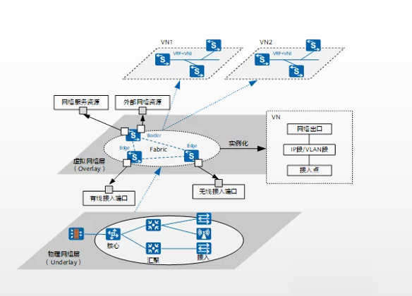 Virtual Network,通过将Fabric实例化,能够构建逻辑上隔离的虚拟网络实例(图中的VN1、VN2)。