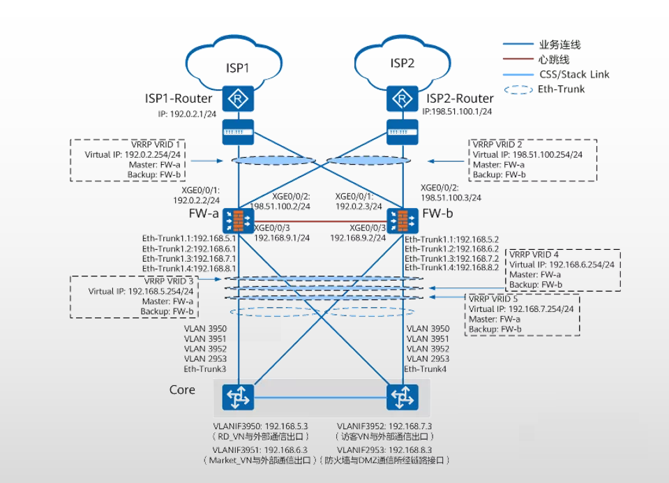 为了保证设备级可靠性,防火墙采用VRRP主备方式的双机热备,核心、汇聚、接入采用堆叠组网。