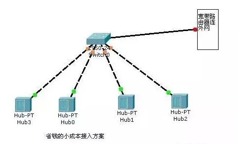 有的企业为了节约成本通常需要这样做,把上图的路由器换成宽带路由器,把交换机换成集线器。因为要节约成本,而且他们学校对网络要求不高。