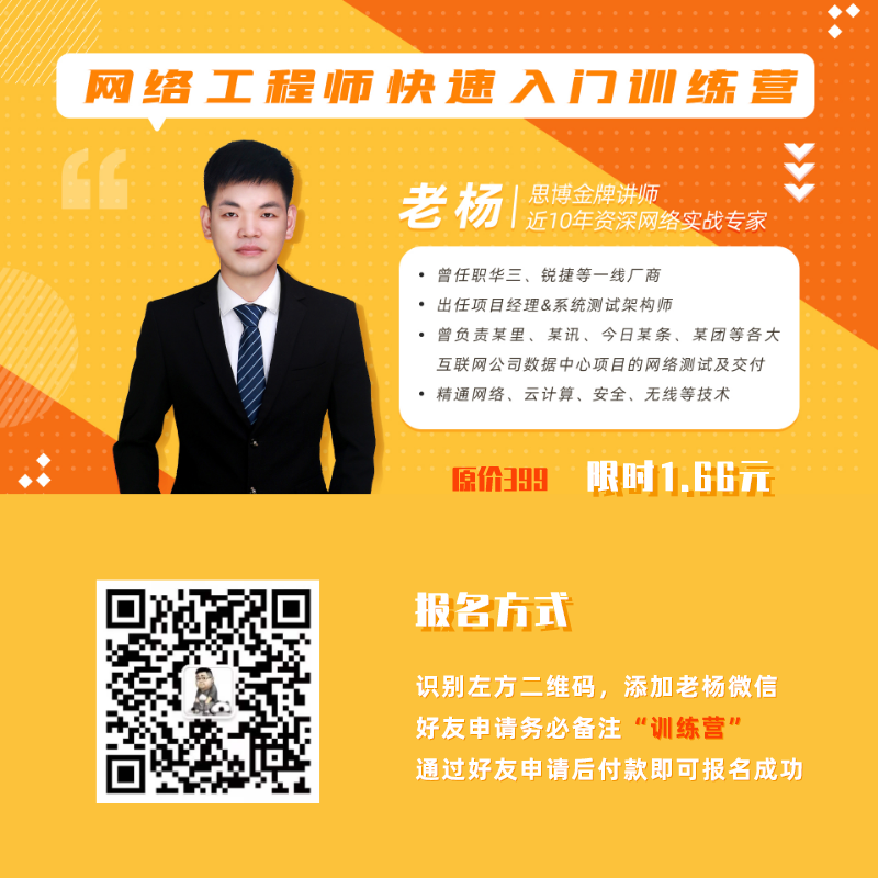 只要1.66元,即可获得由我老杨精心准备的《3天入门高阶网络工程师》课程,有我领路,不迷路
