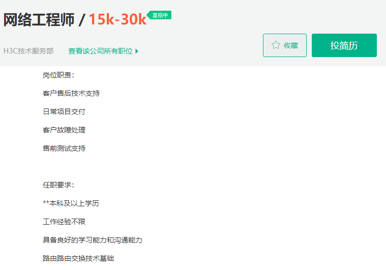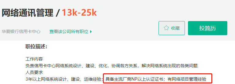 总结一下,甲方对人才的要求是:喜欢招收比较有经验的网络工程师,并对学历有要求。但技术成长比较有限。