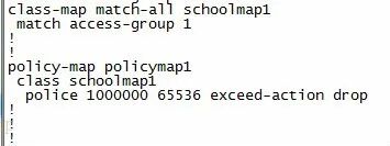 SwitchA(config-pmap)#class schoolmapl //匹配分类映射图SwitchA(config-pmap)#police 1000000 65536 exceed-action drop