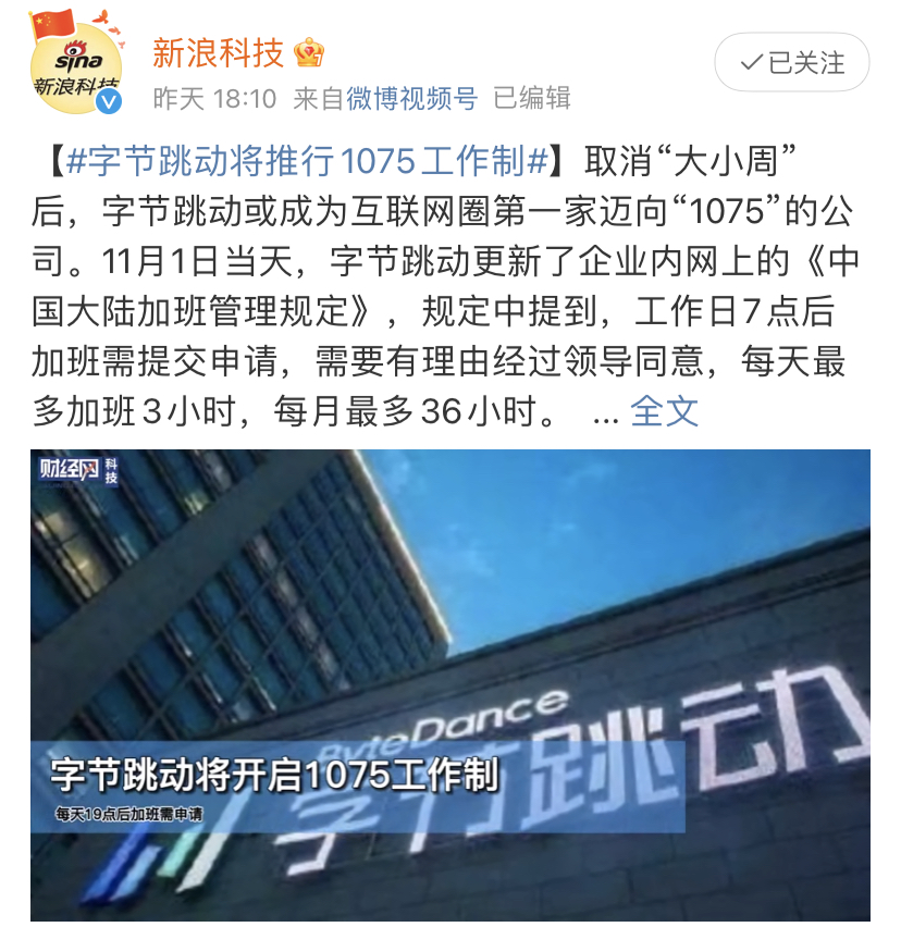 继8月字节取消大小周之后,他们前段时间开始推行1075工作制。