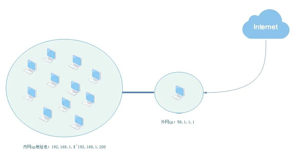 公司有拉了一条联通的专线连接到防火墙,专线的ip地址为58.1.1.1,此时我们将内网的某些192.168.1.x地址通过NAT转换成58.1.1.1就可以访问到互联网。