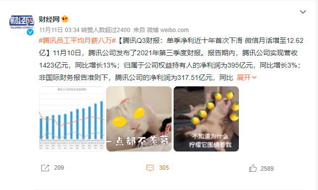 前段时间,腾讯发布了今年最新的第三季度财报:总营收1423.68亿元,同比增长13%;净利润395亿,同比增长3%。