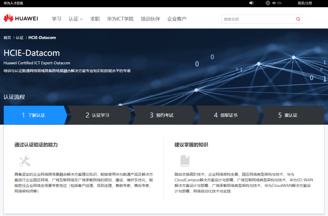华为认证HCIE-Datacom V1.0定位于培养数通网络领域具备跨场景融合解决方案专业知识和技能水平的专家。