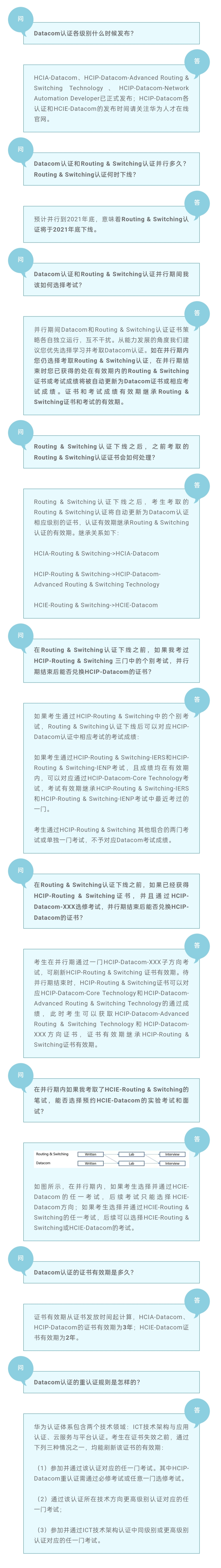 Routing & Switching认证将于2021年12月31日停止销售考券,2022年6月30日停止考试服务,即Datacom认证将和Routing & Switching认证并行到2022年6月30日。