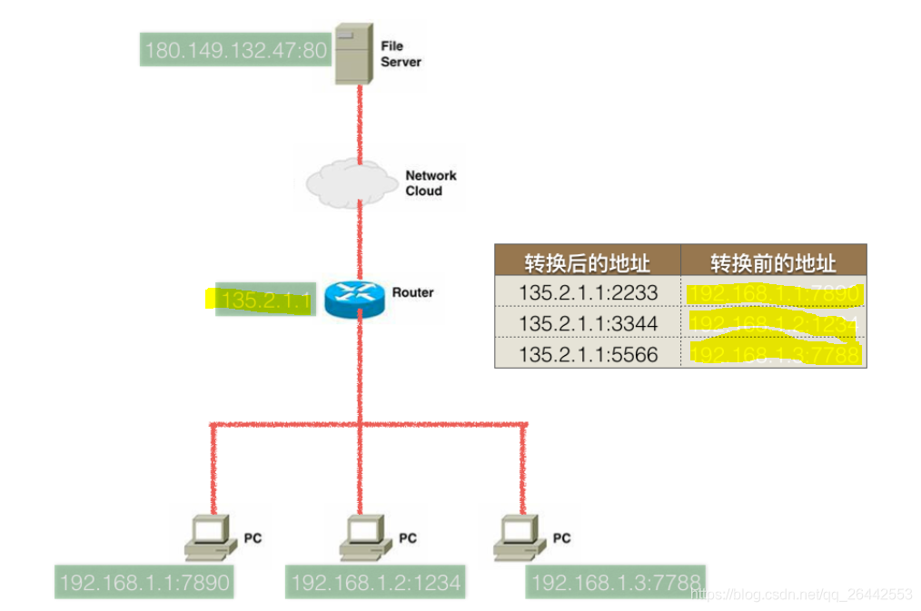 接收数据时,在经过路由器时转换为路由器之前记录的IP以及port:
