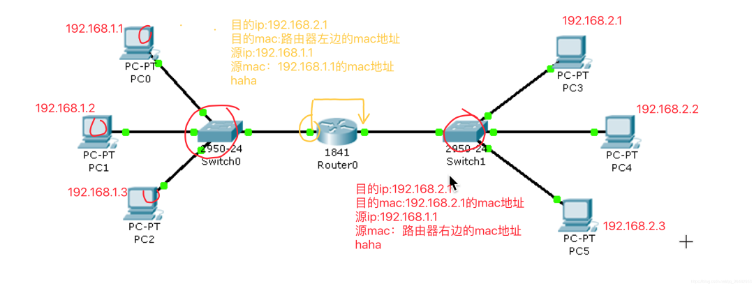 (1)因为PC0和PC3不在同一个网段,所以PC0首先把数据发送给默认网关(路由器Router0)。