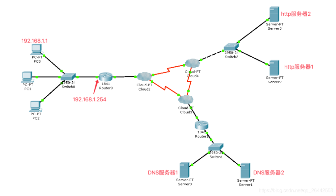 (1)在PC0的浏览器中输入一个网址www.baidu.com时,需要将它先解析出IP地址来。