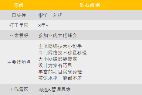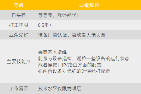 这是老杨整理的网络工程师能力对照表,可以仔细看一下。