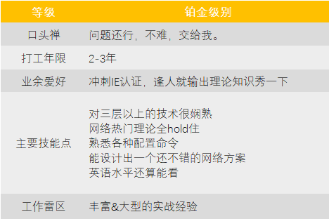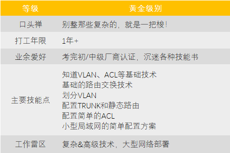 对于一些基础的网络技术,这个阶段的网工都是能拿下的。好像比白银级别好上了不少吧?