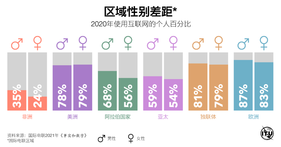 在全球范围内,平均有62%的男性使用互联网,而女性的比例为57%。