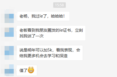 举个最近的案例,我的粉丝这个月初刚刚过了ie,他的现有公司立刻给他涨了5k的薪水。