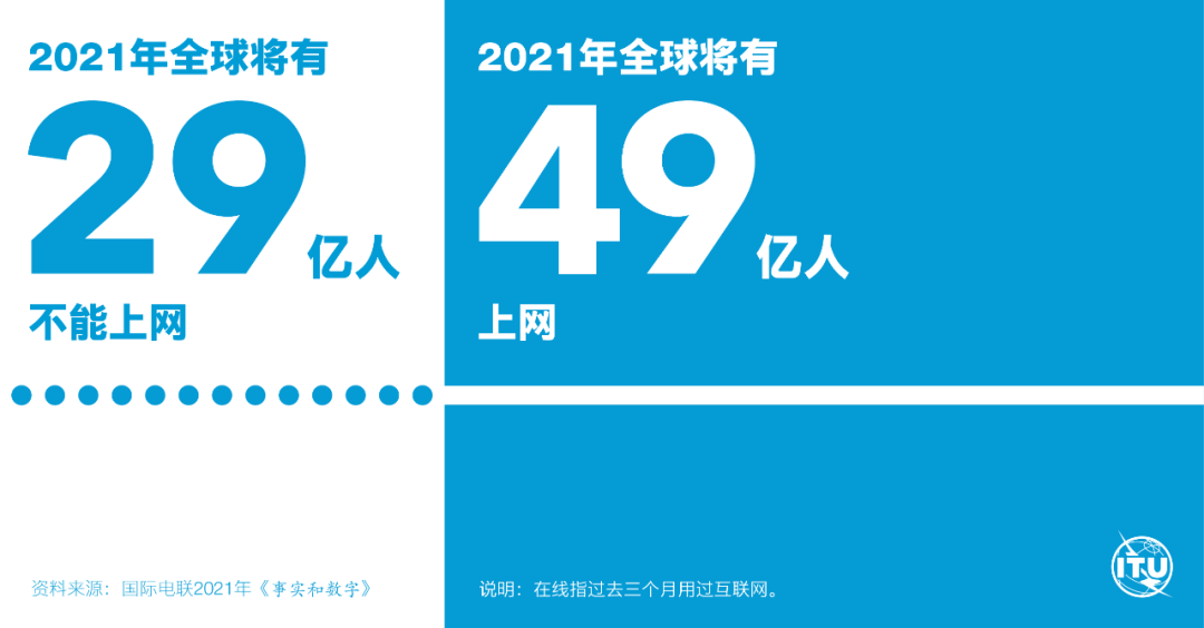 全球互联网使用量强劲增长,使用过互联网的人数从2019年估计的41亿猛增到2021年的49亿。