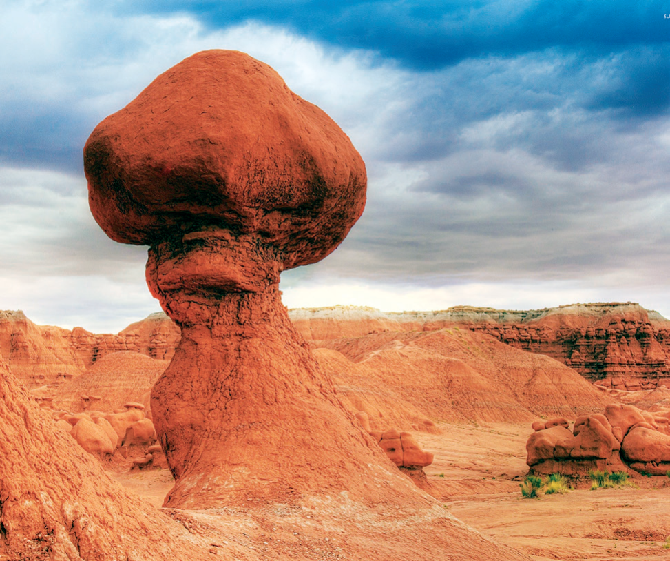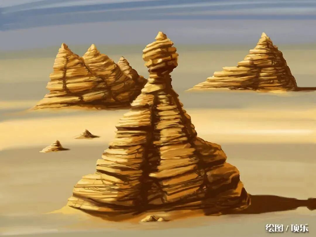 如果雅丹中存在坚硬的地层,风力剥蚀后成为奇特的角锥丘,甚至出现足以载人的突兀平板状角锥丘;