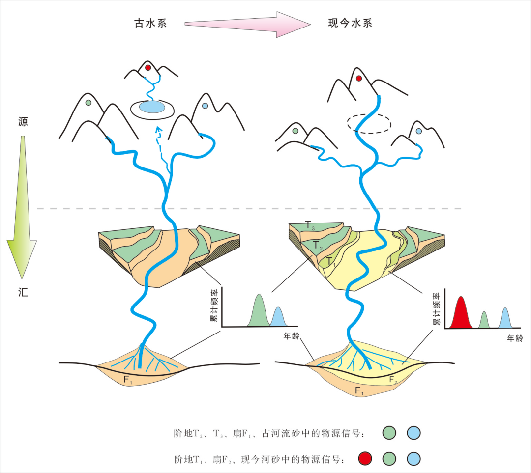 ▲ 利用物源变化反映古水系演化过程原理示意图(据Romans et al.,2016修改)