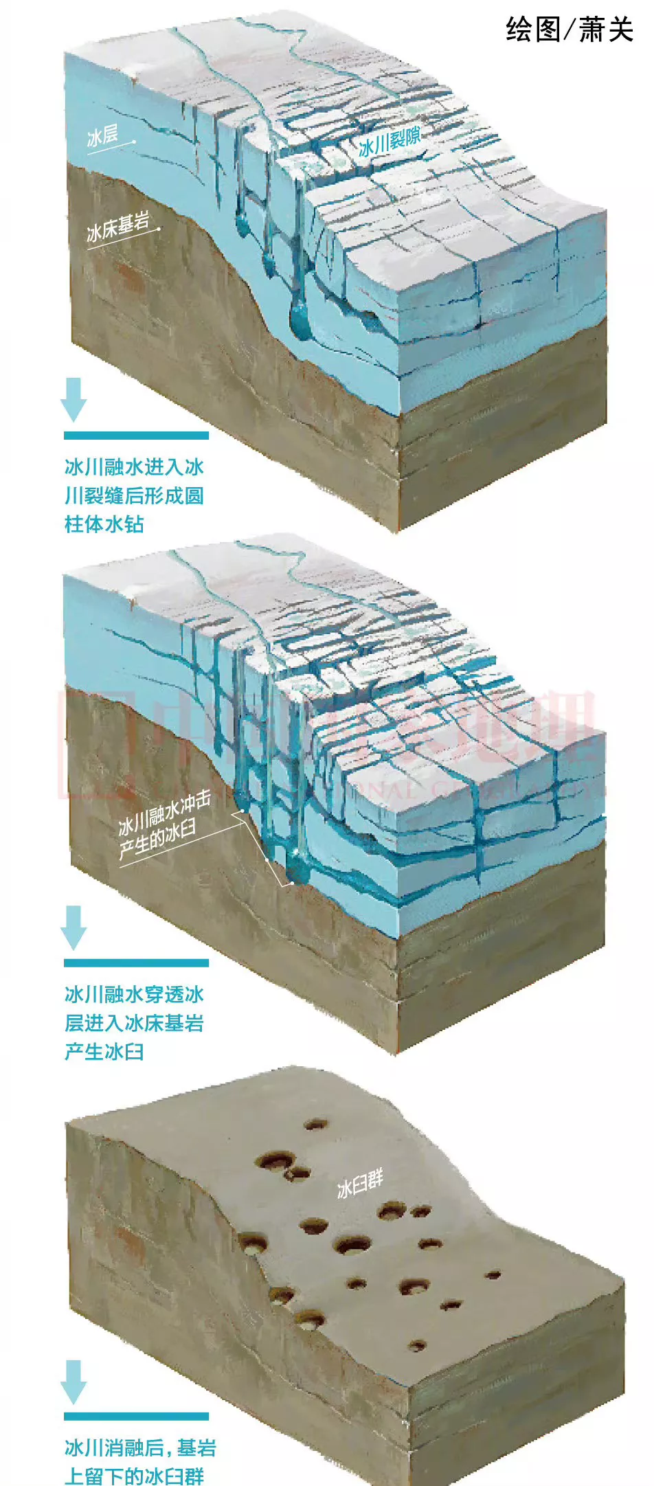 呈“圆柱体水钻”方式向下覆基岩及冰川漂砾进行强烈冲击、游动和研磨,