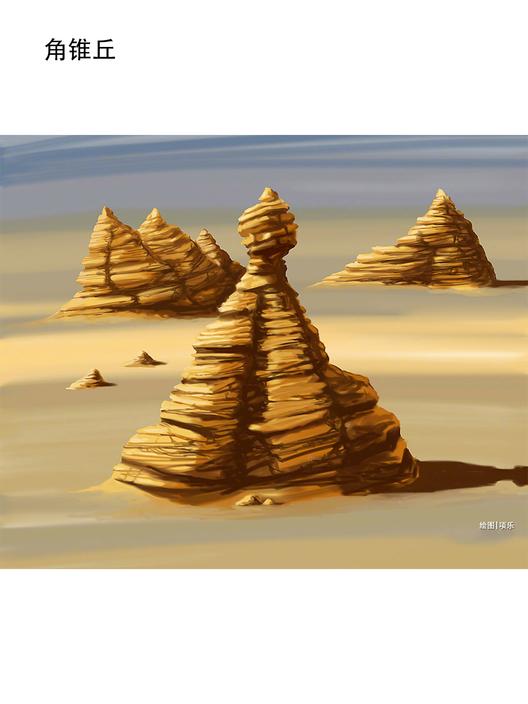 角锥丘:如果雅丹中存在坚硬的地层,风力剥蚀后成为奇特的角锥丘,甚至出现足以载人的突兀平板状角锥丘;